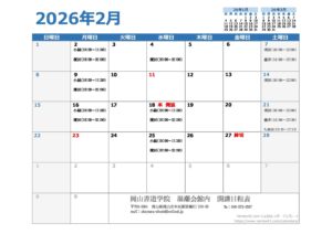 2月の開講日です。 2月は祝日が2日とも、事務所、教室お休みなのでお気をつけください。 よろしくお願いいたします。