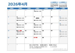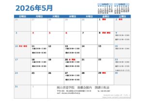 2026年1月の開講日になります。 早いもので、今年も残りわずかとなりました。 12月25日(木)から年明け1月13日(火)まで、事務局のほうは閉まっております。 ご迷惑をおかけいたしますが、よろしくお願いいたします。 […]
